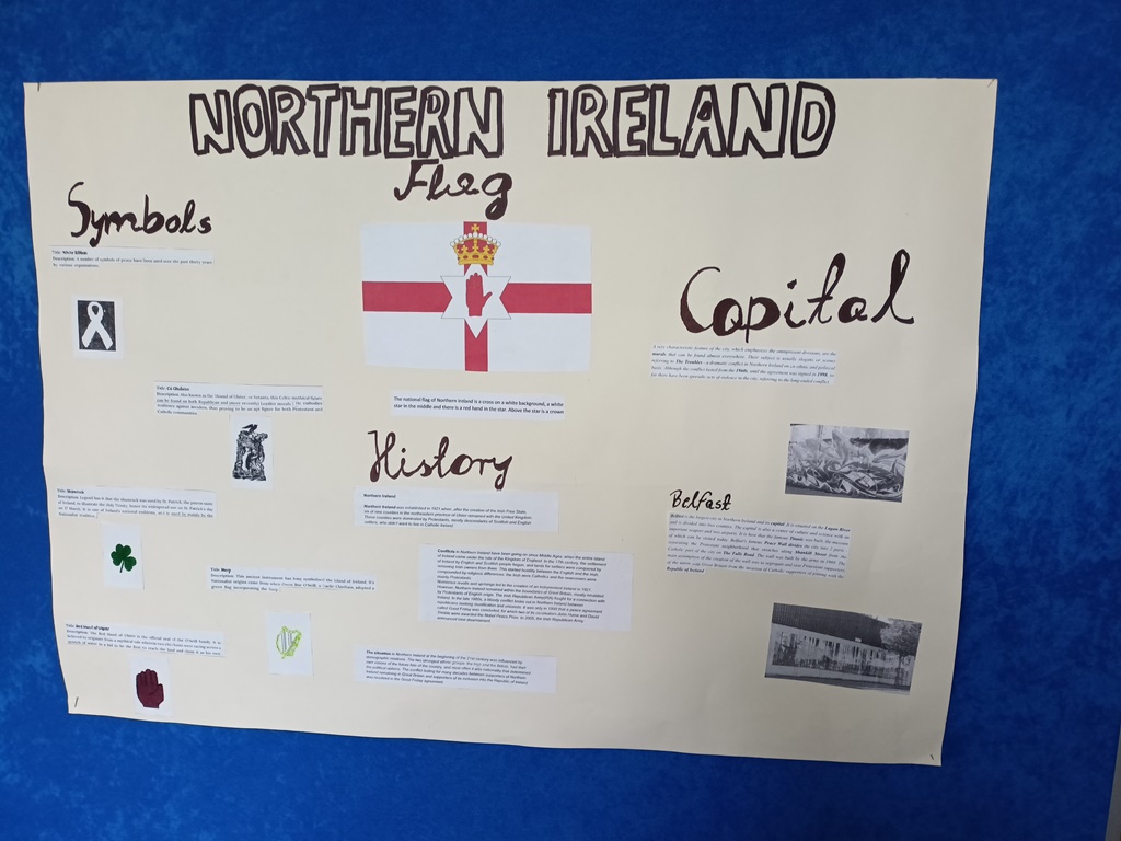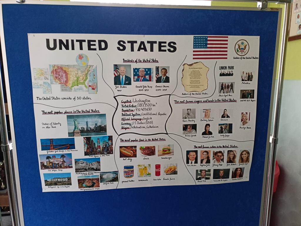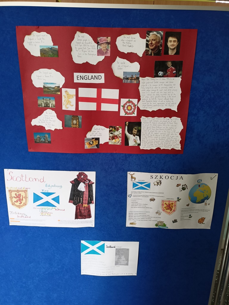 Ale język niemiecki nie był jedynym językiem w czasie obchodów Dnia Języków Obcych w naszej szkole. W obchodach tego szkolnego święta wzięli udział również uczniowie klas 8, którzy przygotowali projekty dotyczące krajów anglojęzycznych: Anglii, Szkocji, Irlandii Północnej i Stanów Zjednoczonych. Plakaty zawierały podstawowe informacje na temat geografii, historii i kultury tych krajów, jak również ciekawostki z dziedziny muzyki i inne. Plakaty zostały zaprezentowane na szkolnej gazetce, gdzie pozostali uczniowie naszej szkoły mogli się z nimi zapoznać.