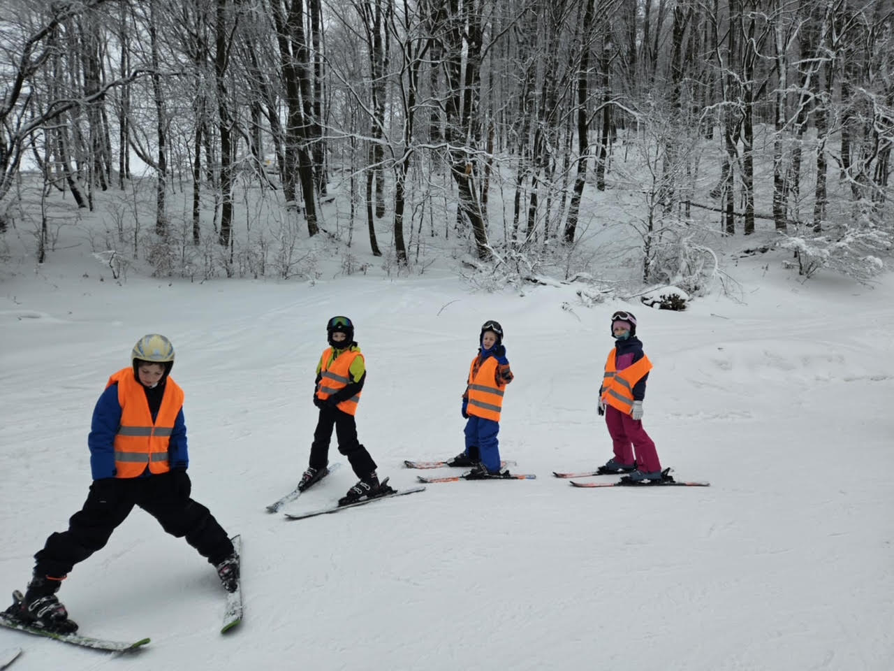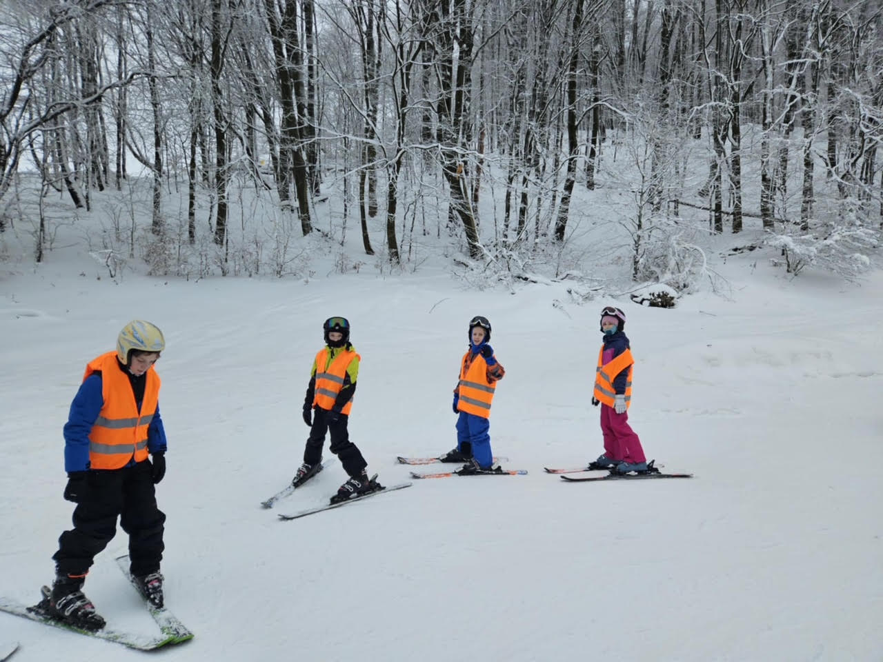 - Grupa początkująca – uczniowie, którzy stawiali pierwsze kroki na nartach. Zajęcia koncentrowały się na nauce podstawowych technik zjazdu, równowagi oraz bezpiecznego upadania.