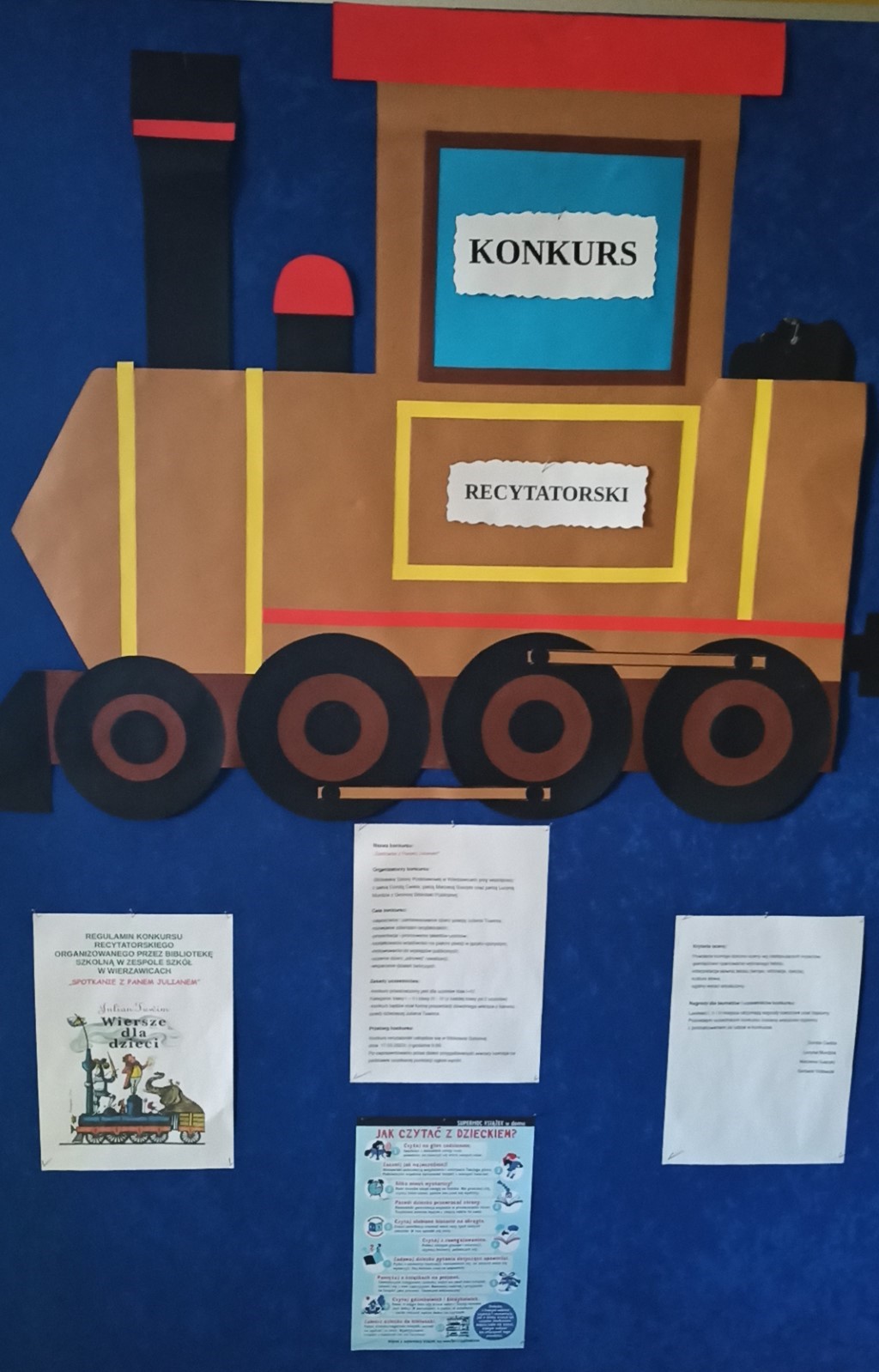 Biblioteka szkolna we współpracy z nauczycielami Dorotą Ćwikła, Marzeną Suszyło oraz Lucyną Murdzia zorganizowała dla uczniów klas I - IV Szkoły Podstawowej w Wierzawicach konkurs recytatorski. Warunkiem uczestnictwa w konkursie była indywidualna recytacja dowolnie wybranego wiersza Juliana Tuwima. Celem konkursu było ukazanie piękna poezji Juliana Tuwima i rozwijanie zainteresowań poezją dziecięcą oraz kształtowanie zdolności recytatorskich.