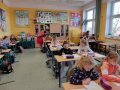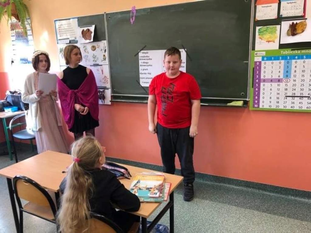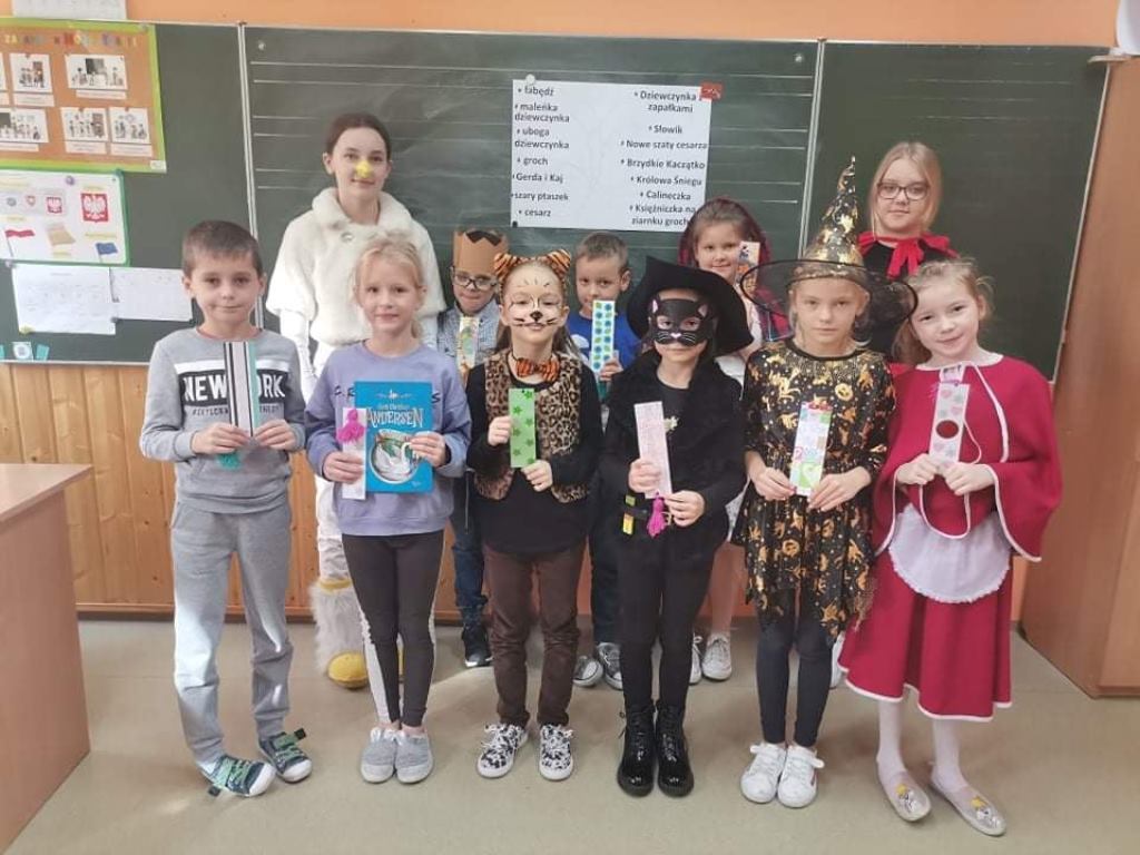 Z tej też okazji uczniowie klas I-III i „0” wzięli udział w spotkaniu z utworami jednego z najpopularniejszych baśniopisarzy - Hansa Christiana Andersena – „W zaczarowanym świecie baśni Andersena”. Aktywnie i z zainteresowaniem uczestniczyli w zabawach wymagających wykazania się znajomością treści utworów, tych bardziej i mniej znanych, m. in. rozwiązywali zagadki, krzyżówki, rozpoznawali bajki po rekwizytach, bohaterach oraz po przeczytaniu ich fragmentu. Jak się okazało, wszyscy bardzo dobrze znają baśnie Andersena, więc świetnie radzili sobie z zadaniami, które przygotowali dla nich członkowie Szkolnego Klubu Wolontariatu.