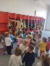 Z dużym zainteresowaniem nasi wychowankowie obejrzeli strój strażaka do gaszenia pożaru i z wielką ochotą przymierzali hełm.
