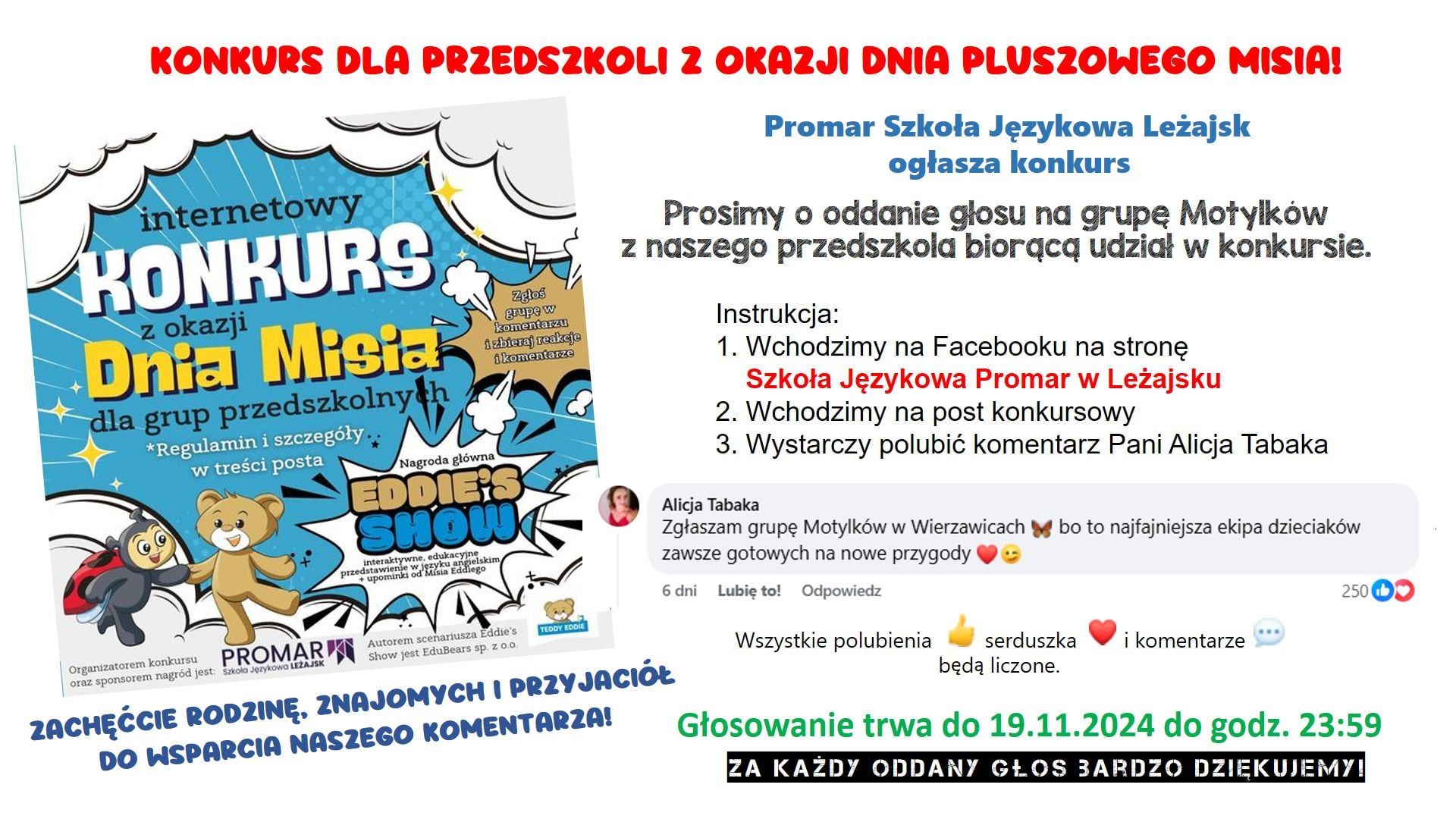 misteddieeddieDzięki wygranej w konkursie z okazji Dnia Pluszowego Misia przedszkole odwiedził miś Teddy Eddie, który był bohaterem interaktywnych zajęć w języku angielskim. Dzieci z wielkim zaangażowaniem uczestniczyły w nauce słówek, rymowanki i piosenki. Po zajęciach Teddy Eddie wręczył dzieciom drobne upominkami i zrobił wspólne zdjęcie.